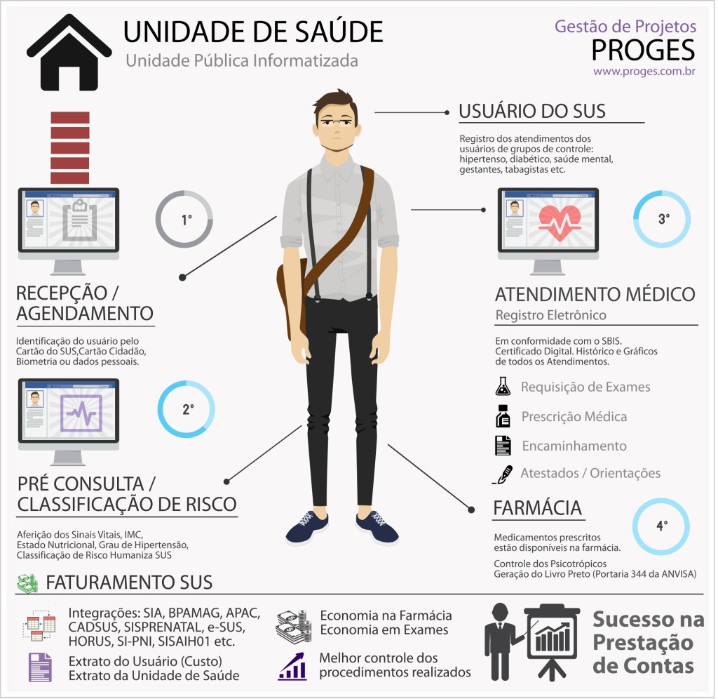 Proporciona a integração com diversos sistemas de informações para troca e alimentação de dados e, de forma muito evoluída, com o Cartão Nacional de Saúde – CNS, definido pela Política Nacional de Informação e Informática em Saúde, como referência para padronização na coleta e produção de informações e, também, para o cadastro de usuários, profissionais e estabelecimentos de saúde. Possibilita também, a configuração de documentos e formulários de acordo com os padrões do município, gerar arquivos para faturamento (BPA) e controlar o acesso e privilégio dos operadores, além de proporcionar consultas para levantamento de informações nos locais que se caracterizar necessário, como por exemplo, no Gabinete do Prefeito.